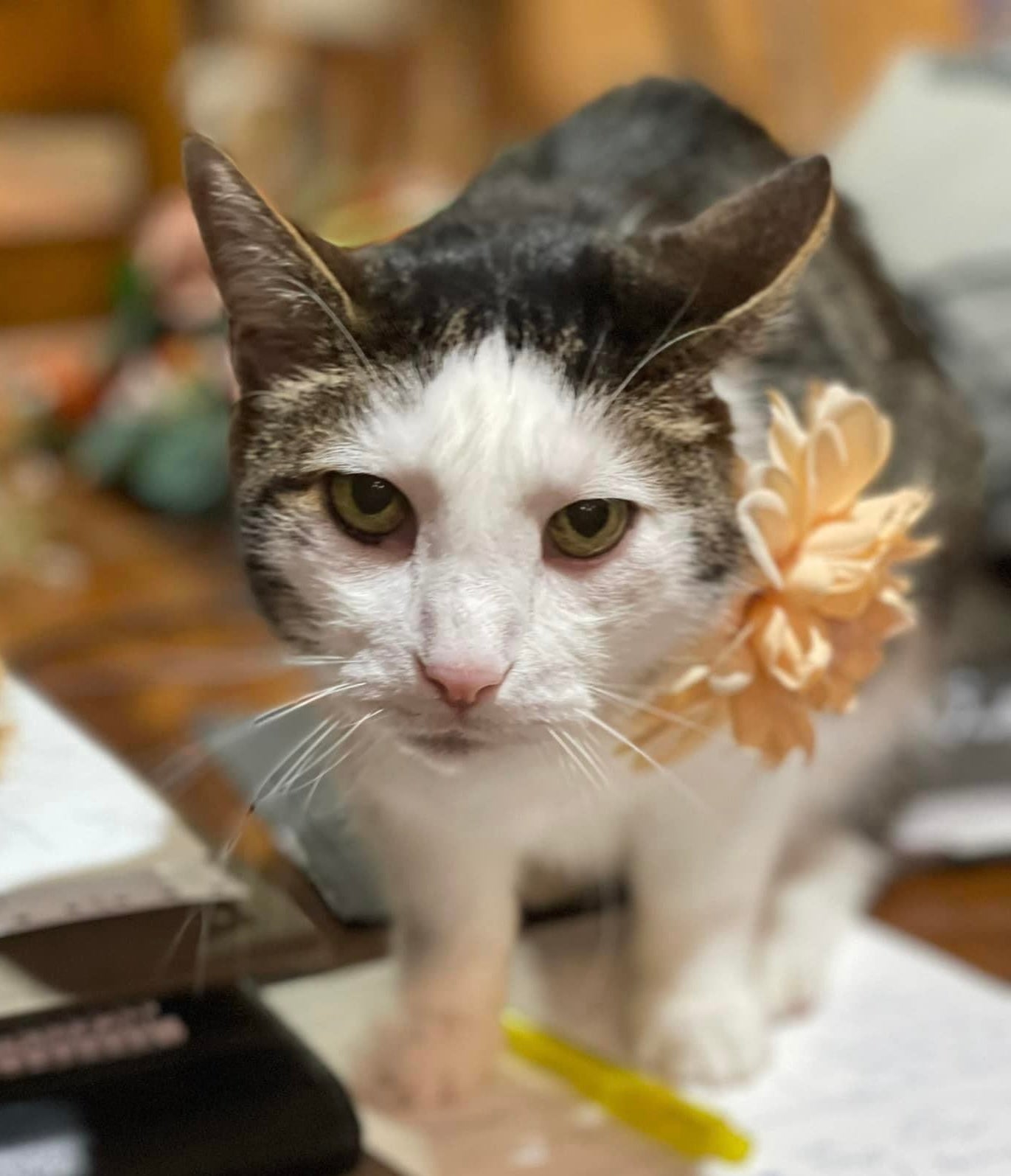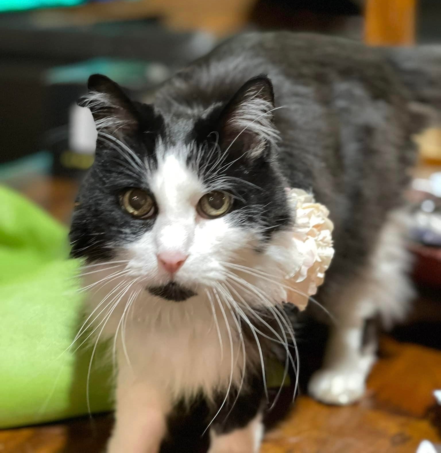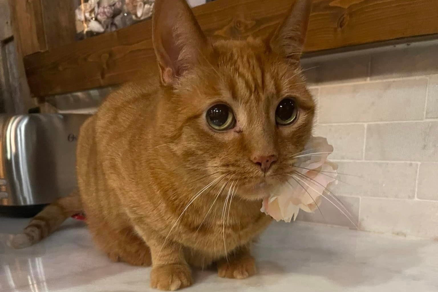 Rufus was found with his twin brother, Stell, in our backyard at just 2 weeks old. Sadly, the rest of their siblings had passed away, and their mom was gone. We took them both in right away, bottle-feeding them to ensure they grew up strong and healthy. Now, at 20 years old, Rufus is a sweet, precious boy who runs the entire house! He loves lounging on the porch on warm days or resting on his dad’s lap. He adores everyone he meets, and they certainly love him back!