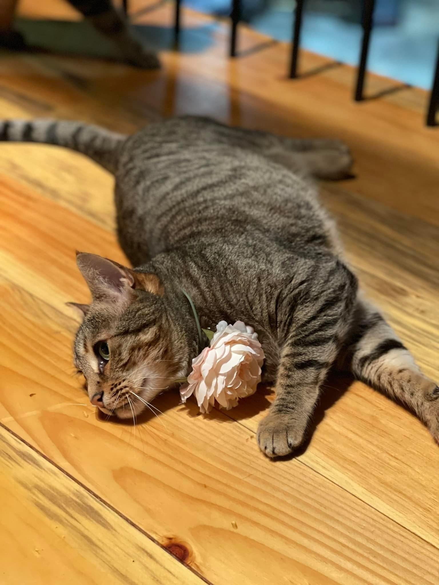 Rastis was our perfect little PetSmart rescue. Our cat Lucky, who was our first baby, passed away on the same day as my mom, leaving our family even more heartbroken. About a month later, my husband went to PetSmart to get food and noticed this beautiful, sweet kitten sitting alone in a kennel. We felt it was the perfect time to welcome another kitten into our family. Rastis is full of life, fun, and loves everyone she meets. She is especially fond of her dad, her brother, and her best friend, Shark.